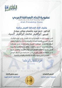 يسر اتحاد الصداقة العربى برئاسة د/ احمد فريد عبد الله و المستشار / سامى العثمانى كمدير تنفيذى للأتحاد انضمام شخصكم الكريم كأحد الشخصيات الفاعلة فى بناء غد افضل لوطننا العربى ونتمنى لكم دوام النجاح والتوفيق