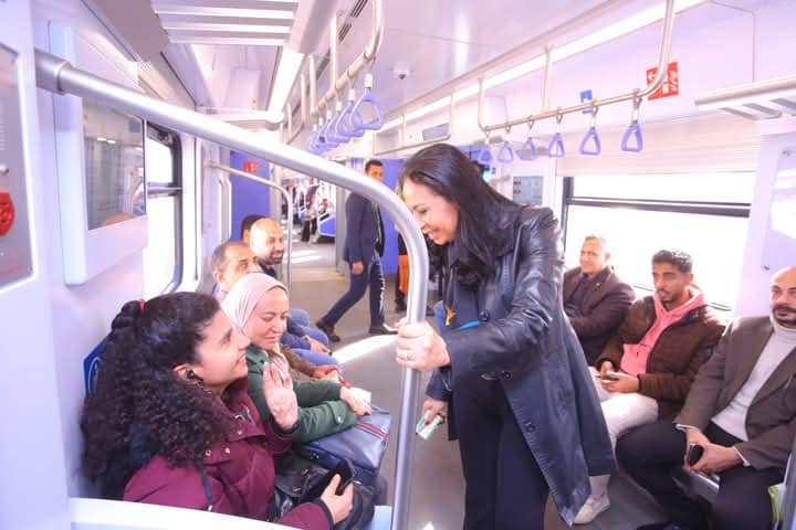 الدكتورة مايا مرسى تستقل القطار متوجهه لمقر الوزارة بالعاصمة الادارية الجديدة