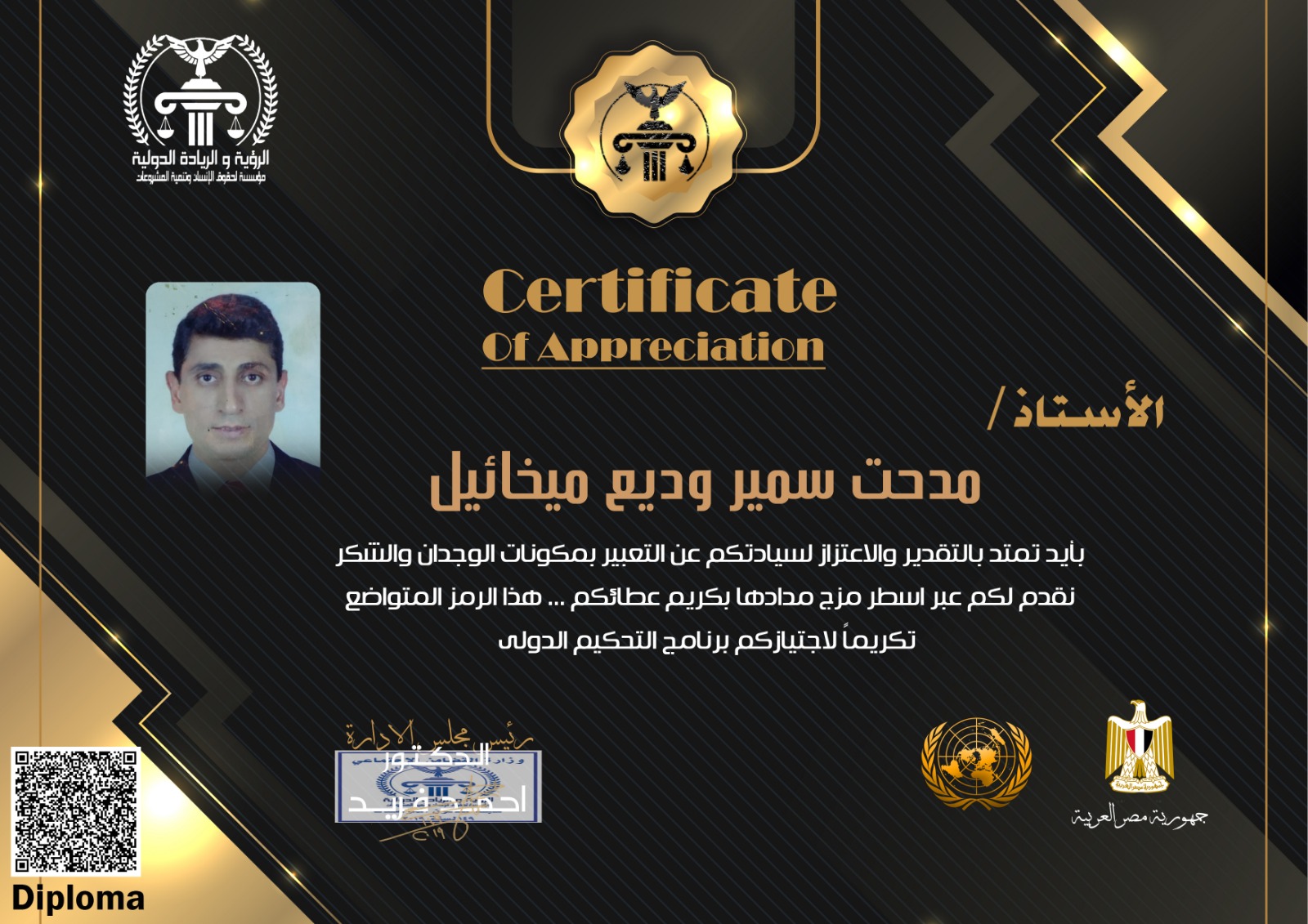 With great pleasure and pride, the Vision and Leadership Foundation extends its sincere congratulations to you. This is a distinctive mark of your membership in the Foundation. We consider it an honor and a valuable asset to our journey toward achieving vision and leadership in our fields of work. We trust your expertise, and you may add many benefits to our goals and mission.